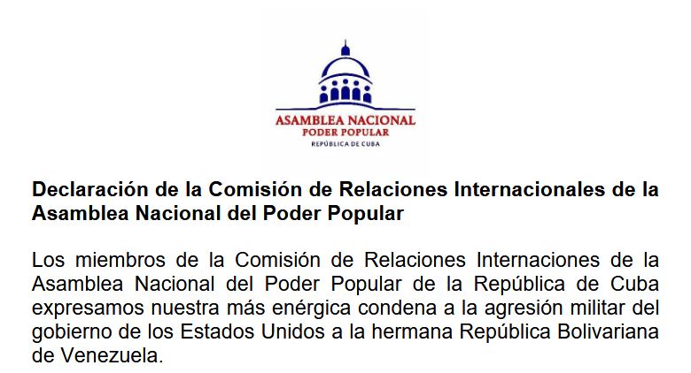 «Los miembros de la Comisión de Relaciones Internaciones de la Asamblea Nacional del Poder Popular de la República de Cuba expresamos nuestra más enérgica condena a la agresión militar del gobierno de los Estados Unidos a la hermana República Bolivariana de Venezuela.