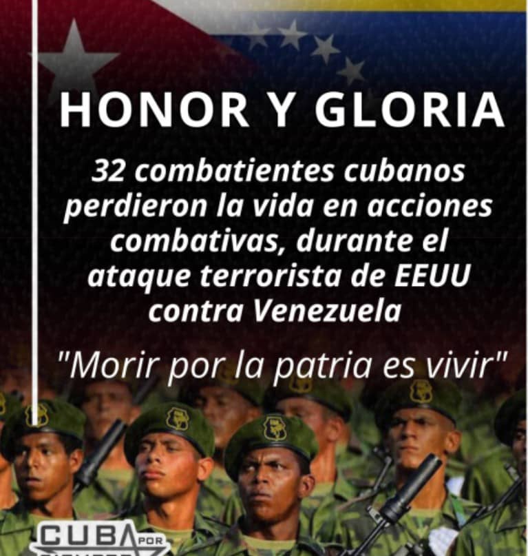 En memoria de los alientes combatientes de las Fuerzas Armadas Revolucionarias de Cuba, en acto de servicio, que fueron asesinados por el imperialismo estadounidense durante el secuestro del Presidente Constitucional de Venezuela, Camarada Nicolás Maduro Moros, y su esposa, la Primera Dama Cilia Flores, el 3 de enero de 2026 en Caracas, la Unión de Demócratas Socialistas (UDS), miembro de la Internacional Antifascista, ofrece sus más sentidas condolencias al Camarada Miguel Díaz-Canel Bermúdez, Presidente de la República de Cuba, al Gobierno cubano, a las Fuerzas Armadas Revolucionarias y al valiente pueblo cubano.