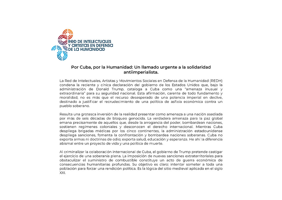 La Red de Intelectuales, Artistas y Movimientos Sociales en Defensa de la Humanidad (REDH) condena la reciente y cínica declaración del gobierno de los Estados Unidos que, bajo la administración de Donald Trump, cataloga a Cuba como una “amenaza inusual y extraordinaria” para su seguridad nacional. Esta afirmación, carente de todo fundamento y moralidad, no es más que el recurso desesperado de una potencia imperial en declive, destinado a justificar el recrudecimiento de una política de asfixia económica contra un pueblo soberano.