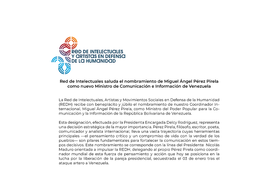 La Red de Intelectuales, Artistas y Movimientos Sociales en Defensa de la Humanidad (REDH) recibe con beneplácito y júbilo el nombramiento de nuestro Coordinador Internacional, Miguel Ángel Pérez Pirela, como Ministro del Poder Popular para la Comunicación y la Información de la República Bolivariana de Venezuela.