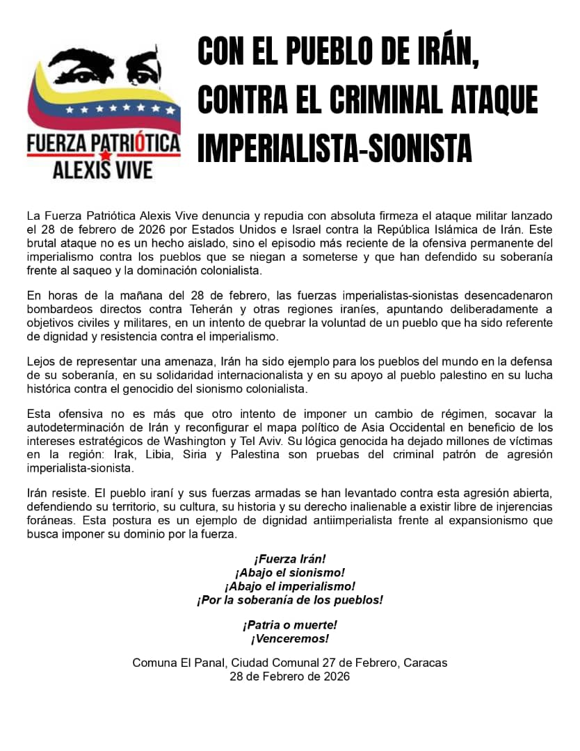 La Fuerza Patriótica Alexis Vive denuncia y repudia con absoluta firmeza el ataque militar lanzado el 28 de febrero de 2026 por Estados Unidos e Israel contra la República Islámica de Irán. Este brutal ataque no es un hecho aislado, sino el episodio más reciente de la ofensiva permanente del imperialismo contra los pueblos que se niegan a someterse y que han defendido su soberanía frente al saqueo y la dominación colonialista.