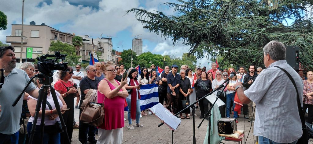 En el acto hicieron uso de la palabra la embajadora de Cuba en Uruguay, Lissette Pérez; el presidente de la Comisión de Asuntos y Relaciones Internacionales del Frente Amplio, Fernando Gambera; un joven representante de la comunidad cubana en Uruguay, Marcel Cabrera y Orestes Hernández, Ministro Consejero de la embajada de Cuba, y adhirieron con sus canciones Javier Luzardo y Diego Cubelli, que musicalizaron poemas de Martí e interpretaron una canción del cantautor cubano Santiago Feliú.
